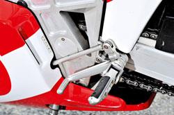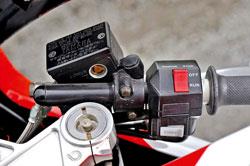 Much of the electrical componentry is Yamaha-sourced too – underneath the funky white/red/black clock facias is the EXUP instrument cluster. The switchgear is Yamaha (albeit with the lightswitch blanked off and the lights wired on permanently) and even the headlights, brake mastercylinder and clutch lever are purloined from the Yamaha spare-parts shelf.