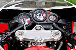 Marzocchi suspension is fully adjustable front and back, and black Brembo calipers are race-derived parts allied to 320mm discs on alloy carriers from the same firm.